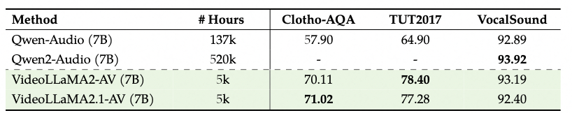| VideoLLaMA2.1-7B-AV (This Checkpoint) | Chat | Fine-tuned BEATs_iter3+(AS2M)(cpt2) | VideoLLaMA2.1-7B-16F |