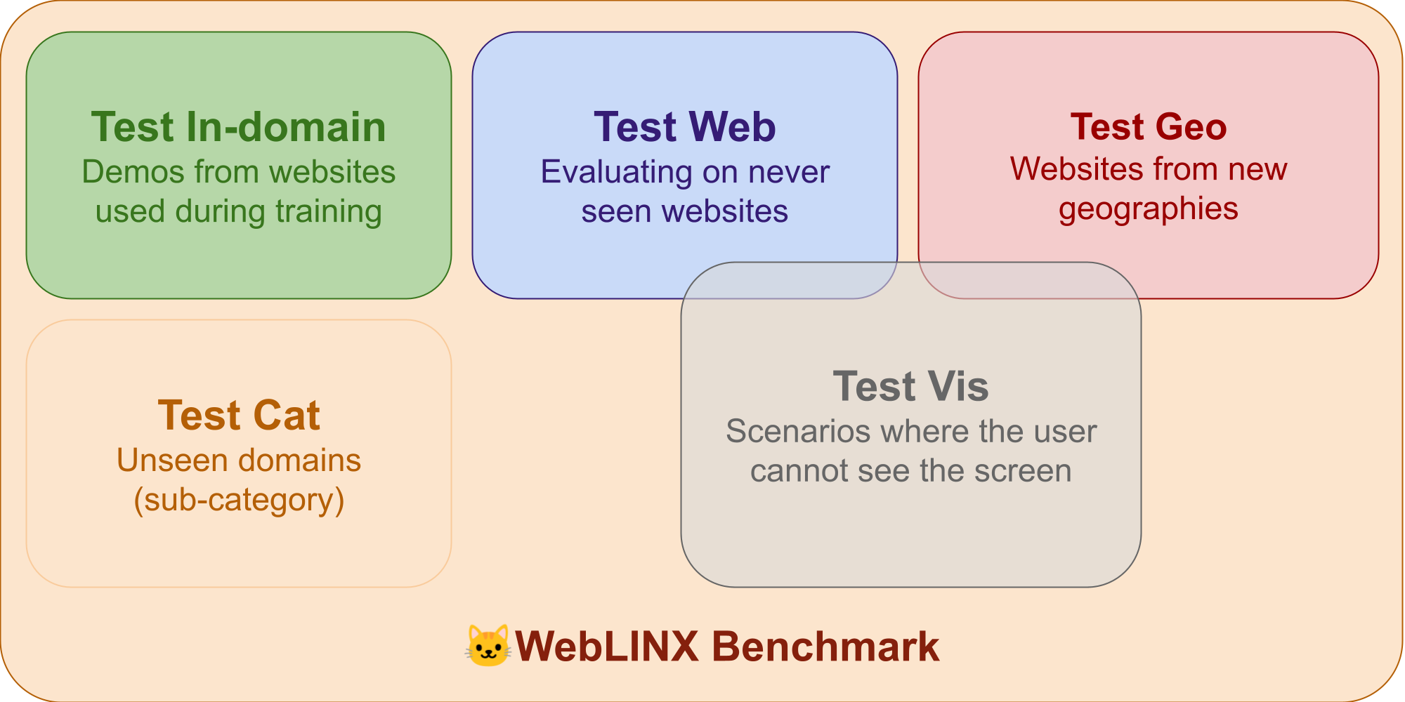 This is why we chose WebLINX as our first benchmark. In addition to the training split, the benchmark has 4 real-world splits, with the goal of testing multiple dimensions of generalization: new websites, new domains, unseen geographic locations, and scenarios where the user cannot see the screen and relies on dialogue. It also covers 150 websites, including booking, shopping, writing, knowledge lookup, and even complex tasks like manipulating spreadsheets.
