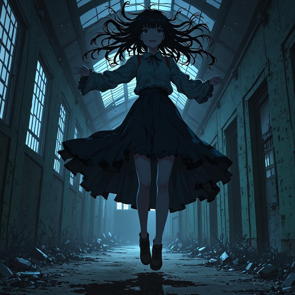 - animexl ,An anime-style girl with dark, hollow eyes and an eerie smile, floating above the ground in an abandoned building. Her hair flows upwards as if weightless, and a dark, shadowy aura surrounds her body. Her arms are stretched out to the sides, fingers slightly curled, and shadows twist around her like dark mist. The building is decrepit, with broken windows and cracked walls. Style: horror, ethereal and ghostly, dark and intense atmosphere, supernatural vibe.