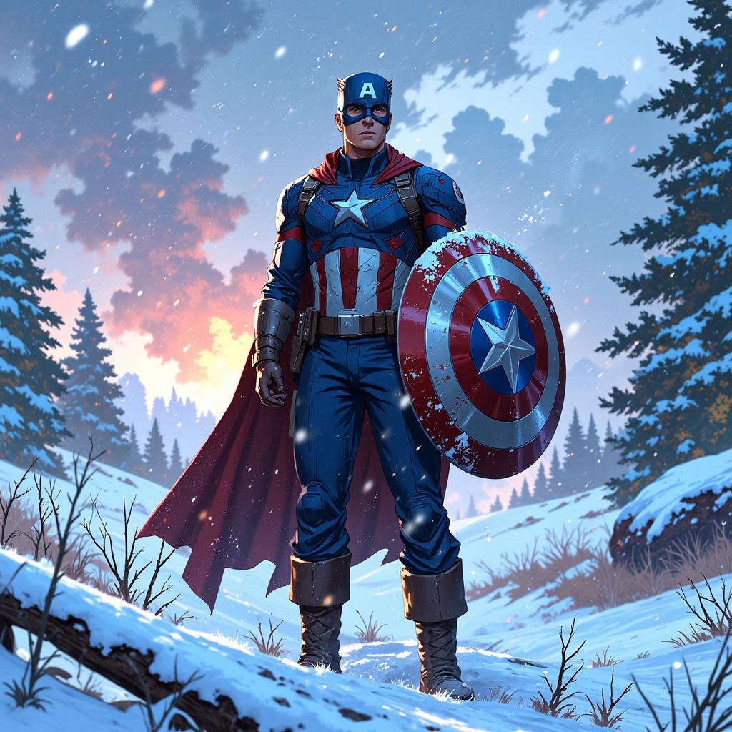 - animexl, Captain America, holding his iconic shield, standing in a snowy battlefield with snow falling around him. His blue and red uniform contrasts against the white snow, and his shield shows signs of battle, with frost clinging to its edges. He looks determined, with snow-covered trees and distant explosions faintly visible in the background. Style: heroic, detailed snow effects, cinematic and action-packed