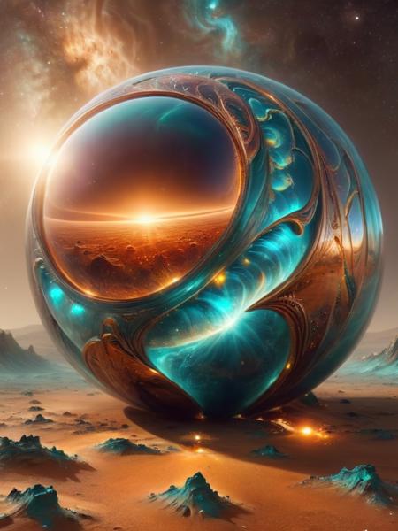 - A bronze and teal planet beneath a tangerine sun submerged in a fractal jewel galaxy , alienzkin