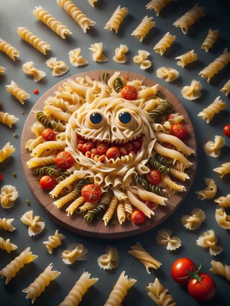 - massive noodle monster, big evil smile, evil face, monster made out of noodles, tomato sauce, flying tomatoes, (dark mirror background:2), made out of noodles, evil scene, dark scene, fight scene, noodlez