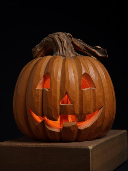 - w00dn figure carving, a pumpkin with a face is smiling, black background.