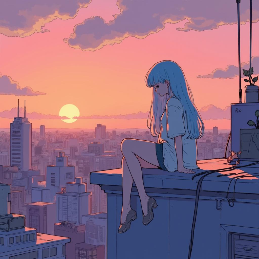"a girl with blue hair sitting on a rooftop at sunset, legs dangling over the edge"