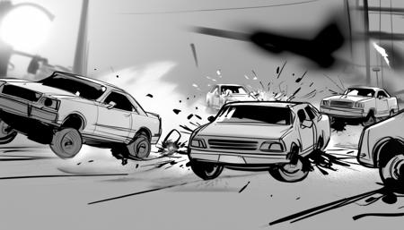 - storyboard sketch of Demolition derby in full swing, cars smashing into each other, metal crunching and sparks flying.