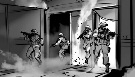 - storyboard sketch of SWAT team breaching a door with explosives, wood splinters and smoke filling the air.