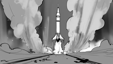 - storyboard sketch of Rocket launching from a spaceport, flames and smoke billowing, shaking the ground.