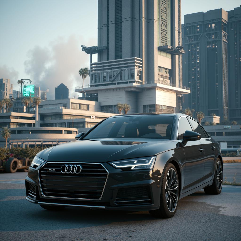 - Audi sedan car parked in front of massive building, architecture style of CYBRPNKZ
