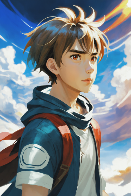 image = pipeline('2010s anime style digital painting, 1boy, man, ruggedly handsome, noon, scenery, "at the Infrared soaring infinity"').images[0]