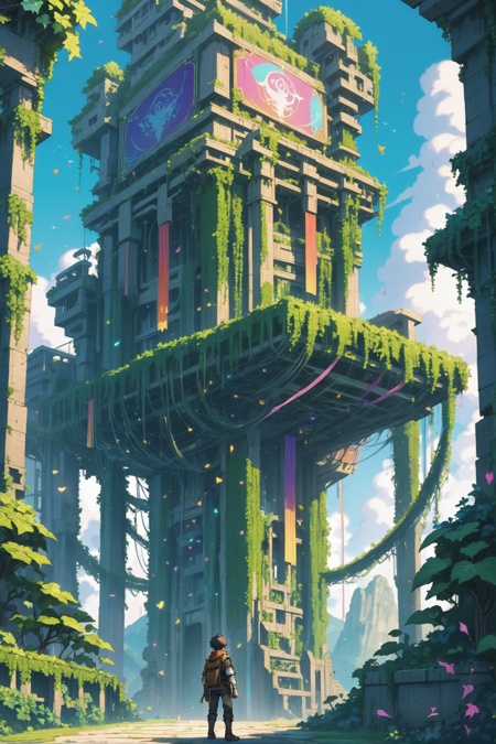 - colorful, ivy,colorful banners, anime style, 1boy, man, ruggedly handsome, whimsical,Dystopian fantasy megastructure beyond the beginning of time