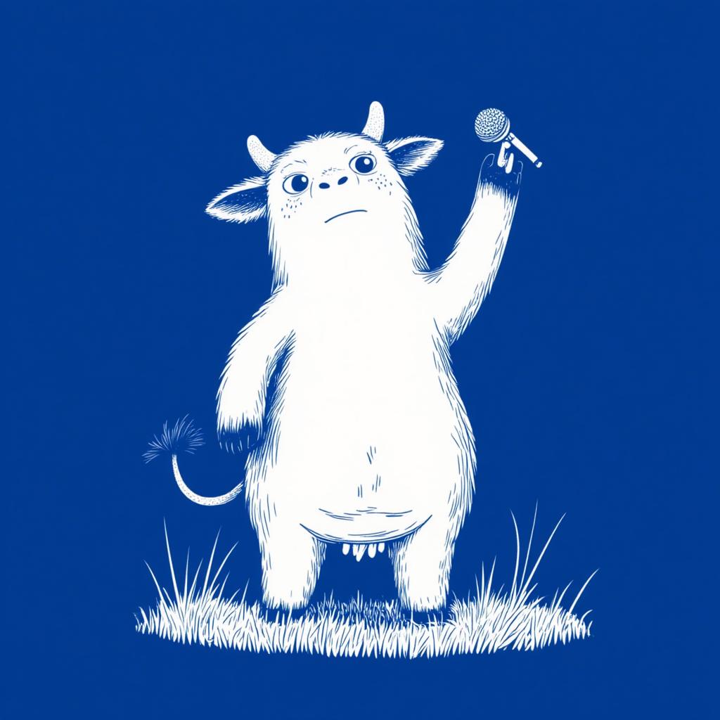 - close-up portrait of a happy peaceful cow dancing and singing holding a microphone. deep blue, white lines illustration, in the style of TOK
