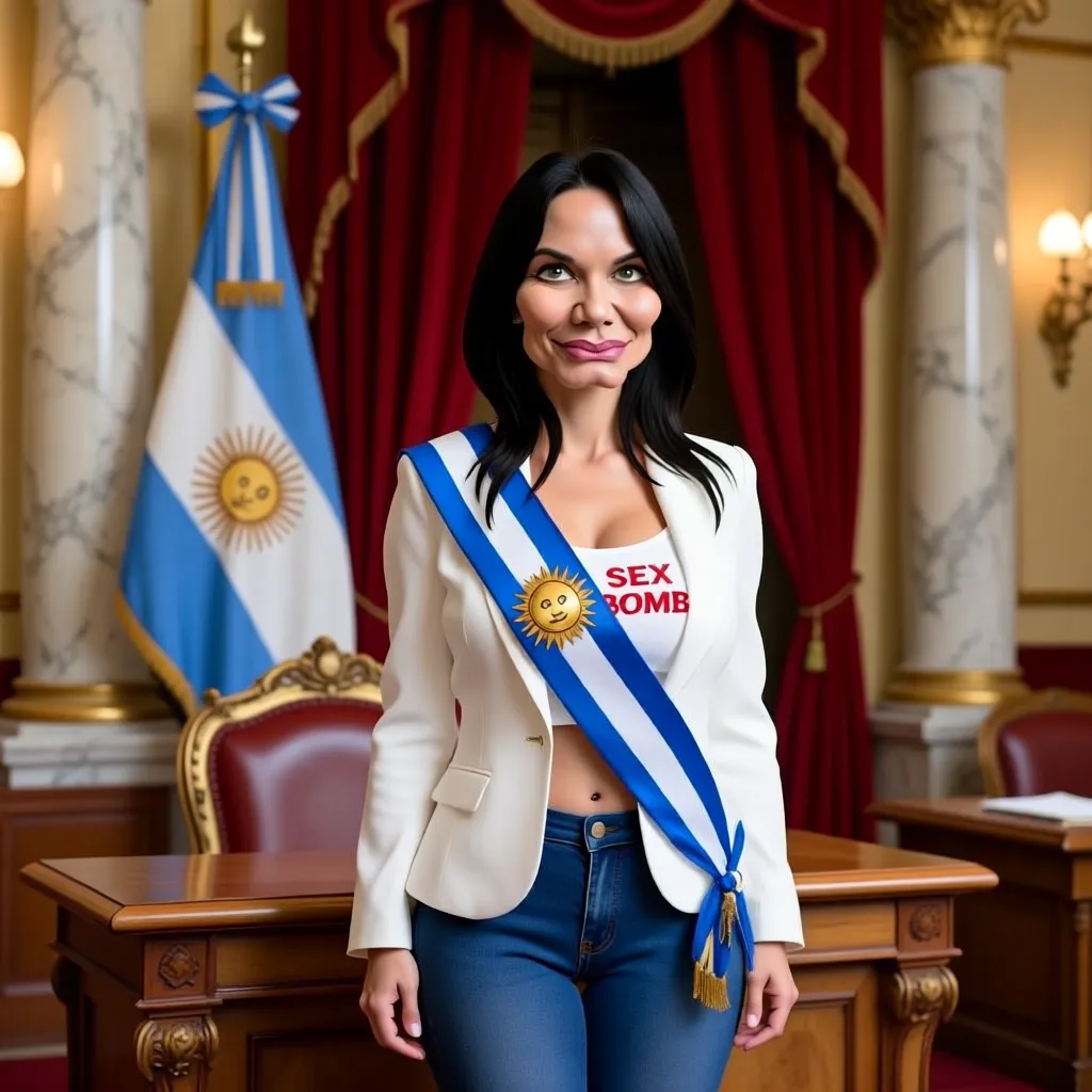 STYPRS A woman standing in the Argentine Senate chamber during an official ceremony. She wears a formal white suit and the blue-and-white presidential sash of Argentina diagonally across her chest, fastened with a golden sun emblem. Behind her, the Argentine flag hangs vertically with its light blue and white stripes and the golden Sun of May at the center. The setting is grand and ceremonial β marble columns, red velvet curtains, and polished wooden desks surround her. She stands at a podium or in front of an ornate chair, illuminated by warm institutional lighting. Her expression is solemn and composed, symbolizing the moment of taking office. She has medium-length black hair and wears a white crop-top with red letters written "SEX BOMB". She is wearing tight bluejeans.