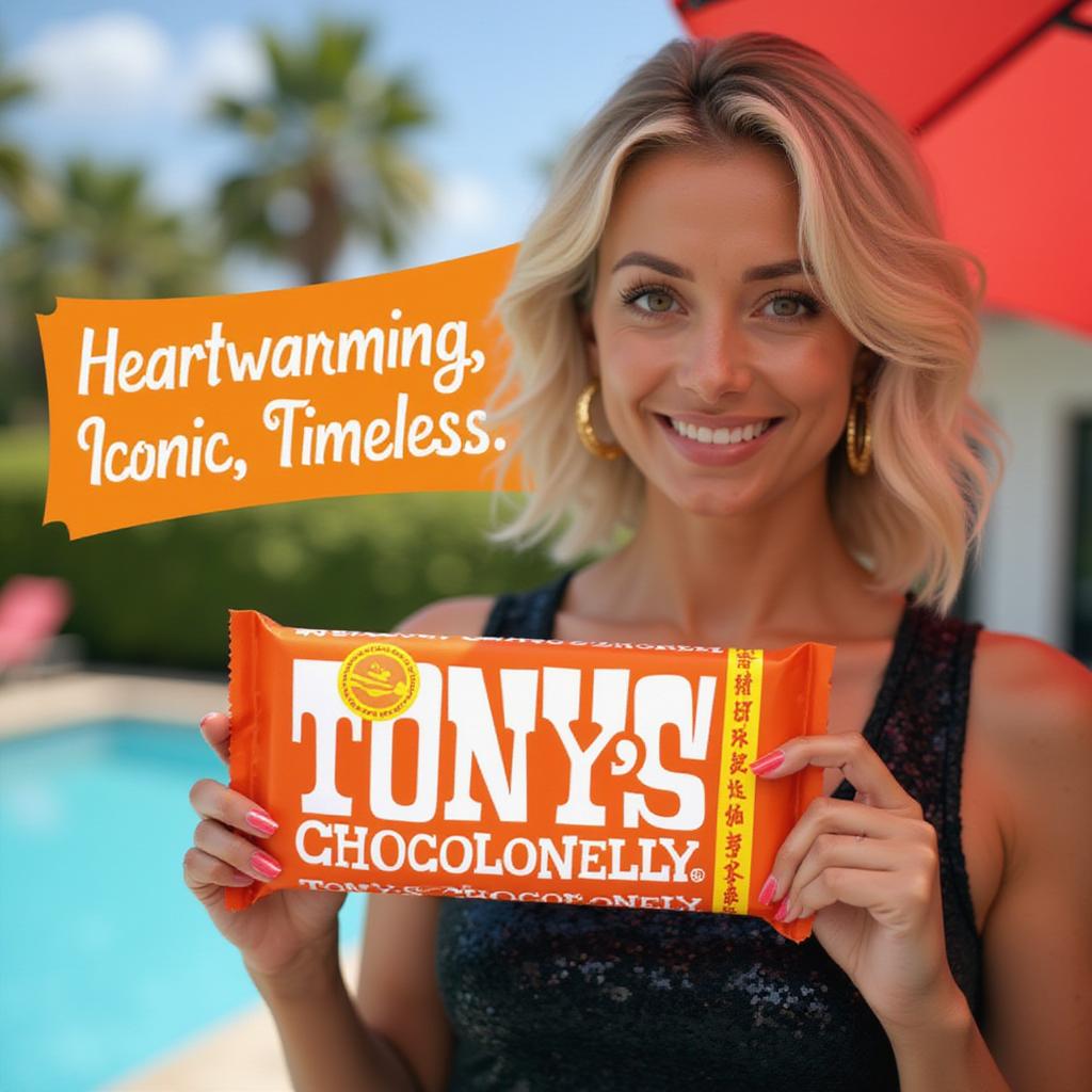 - TV advertisement, handwritten text on a banner saying "Heartwarming, Iconic, Timeless", above it A woman with short blonde, wavy hair, wearing a glittery black top and gold hoop earrings, holds up an orange-packaged bar of 'Tony's Chocolate.' The chocolate bar packaging is bright orange, with bold white lettering, standing out prominently. The woman has red nails and a confident expression. The background is vibrant, with a tropical setting near a pool, reflecting a sunny, refreshing summer atmosphere. The overall aesthetic is modern and upbeat, with bold colors and clean design. Cyrillic text on the image is promoting the chocolate, replacing the original product.