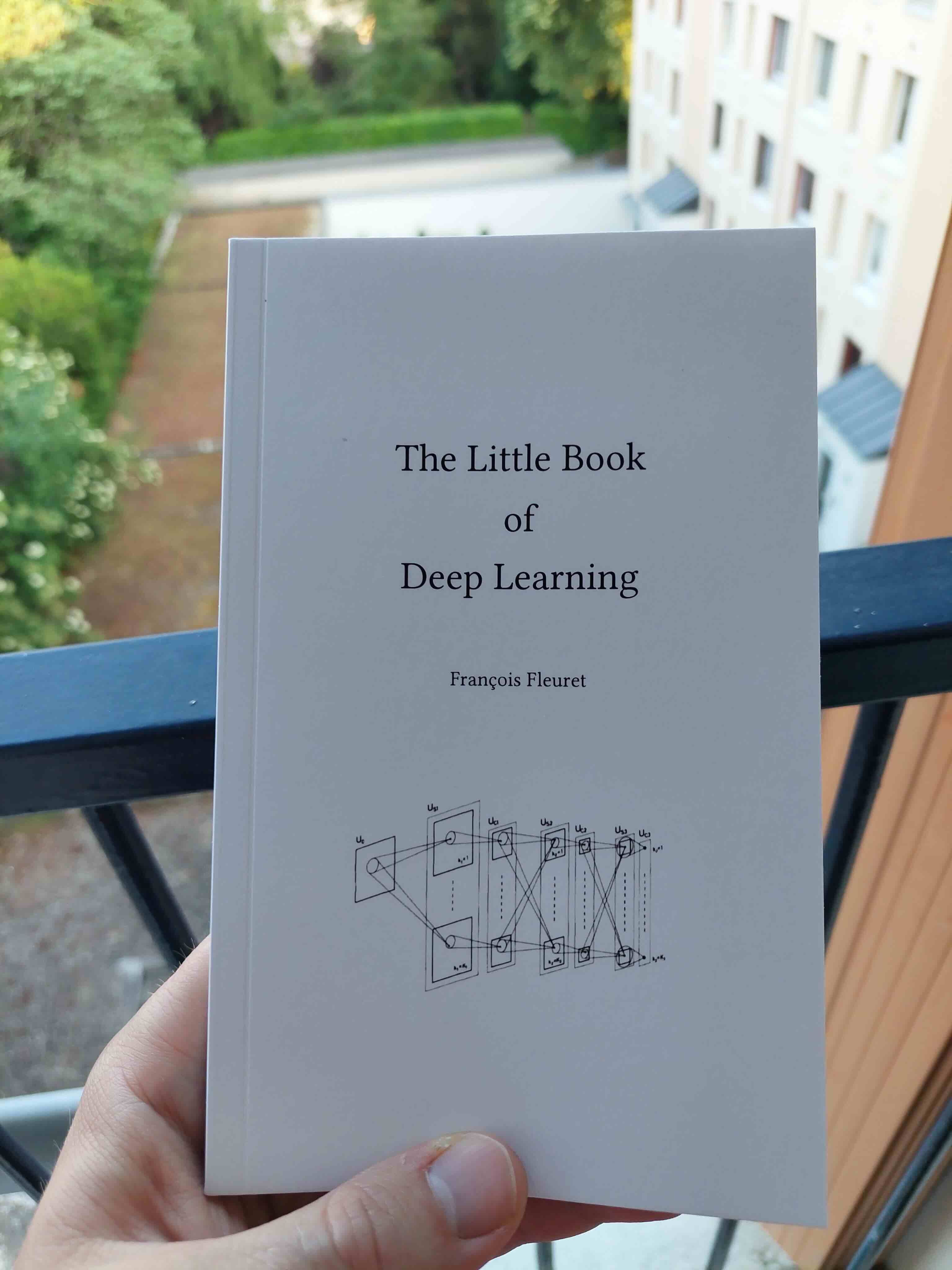 What can you tell me about this book? The book appears to be a white booklet titled "The Little Book of Deep Learning." It is held in a person's hand, and it seems to be a personal possession. The book's content focuses on the basics of deep learning, which is a field of artificial intelligence that uses neural networks to process and analyze data. It is likely that the book provides an introduction to the concepts and techniques involved in deep learning, making it accessible for beginners and helping them understand the fundamentals of this advanced machine learning approach.