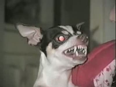 What kind of dog is in the picture? The picture features a small dog, possibly a Chihuahua, with red eyes and a mean, hungry-looking expression.
